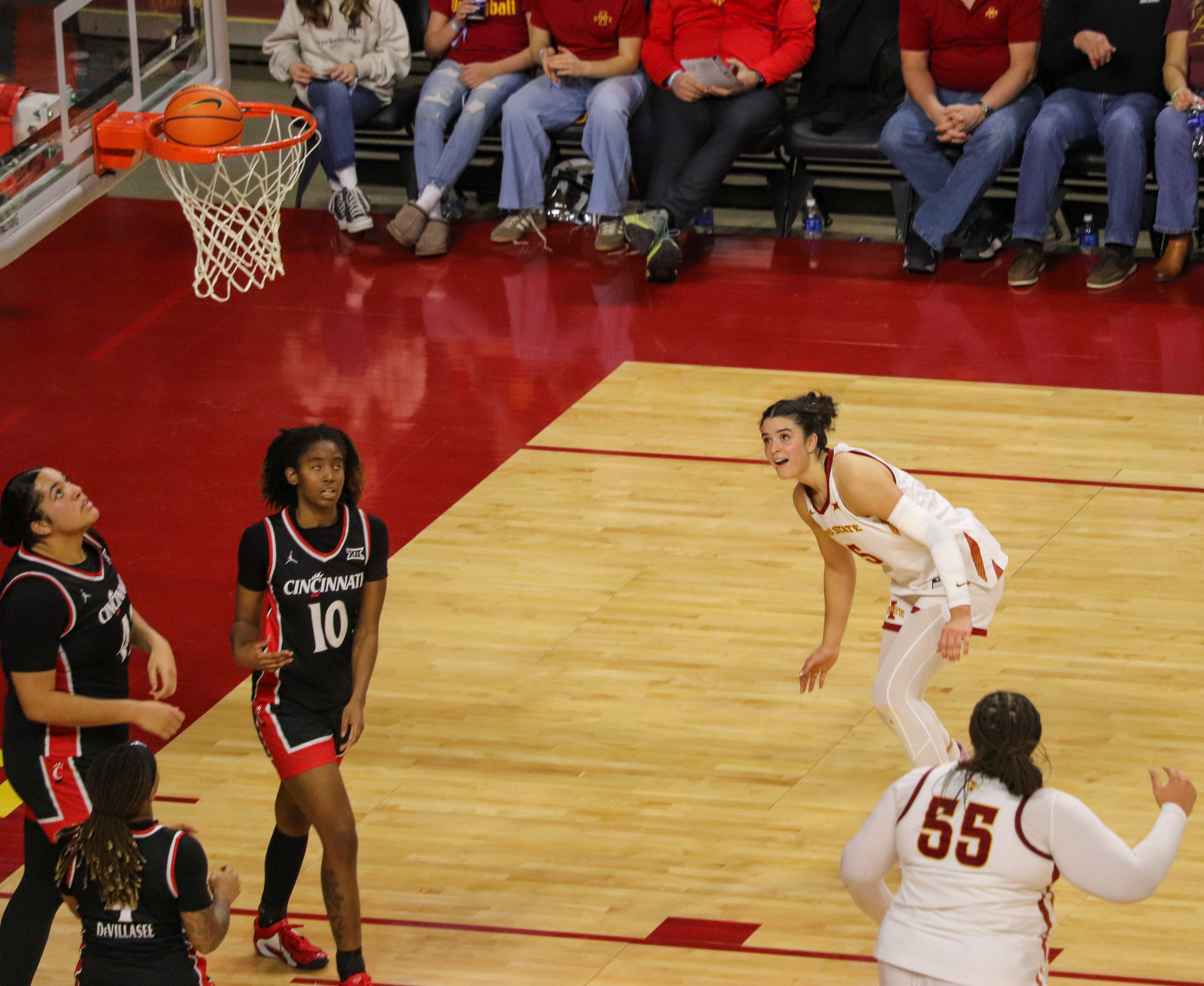 The Bearcats kept it close for the first three minutes (6-6) before the Cyclones closed the quarter on an 15-6 run. Joya Crawford opened the second quarter with a jumper, but Iowa State went on a 8-1 run over the next four minutes. Cincinnati pulled within 13 points at halftime, 41-28. The visitors from Ohio connected on seven straight points over two minutes – pulling within eight with 7:18 in the third. A seven point Cyclone lead (48-41) with 4:09 remaining in the third quarter was as close as Cincinnati got for the remainder of the game.